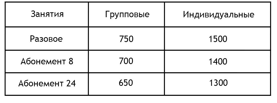 Цена за 1 занятие зависит от типа абонемента который Вы выберите.